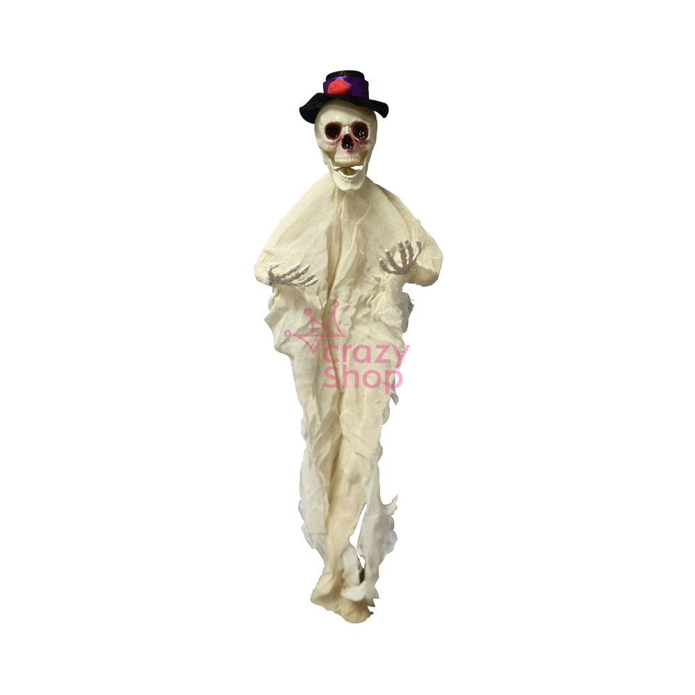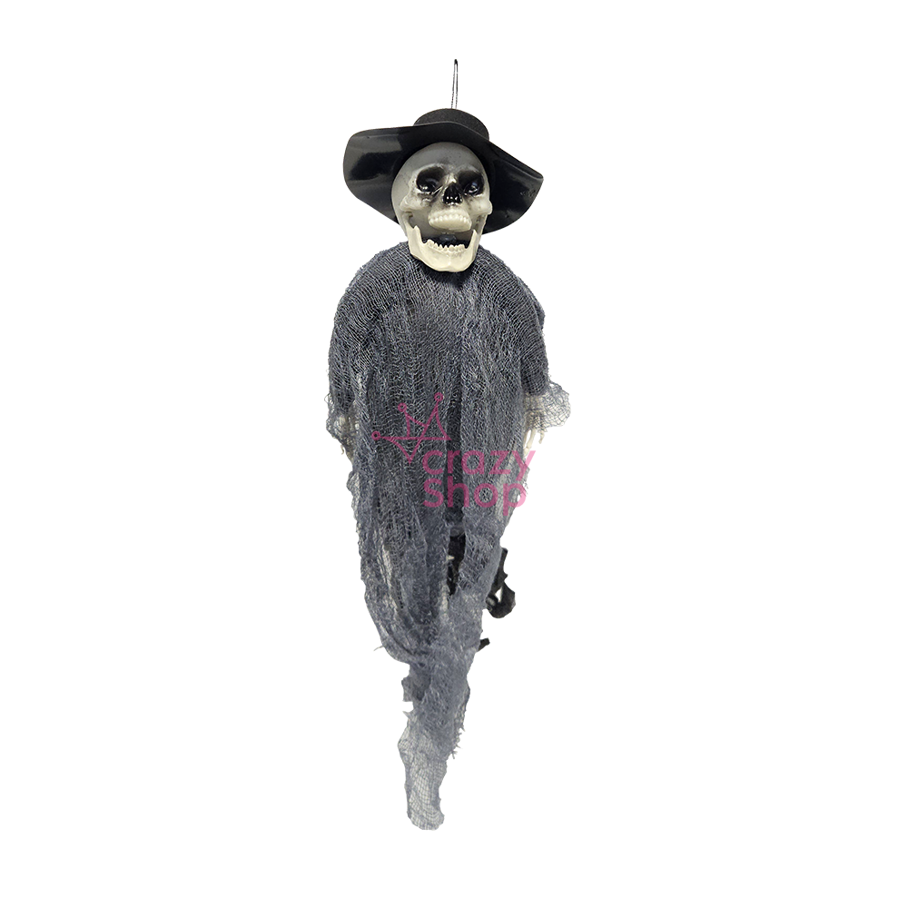 ESQUELETO COLGANTE CON SOMBRERO Y TELA 40CM HALLOWEEN