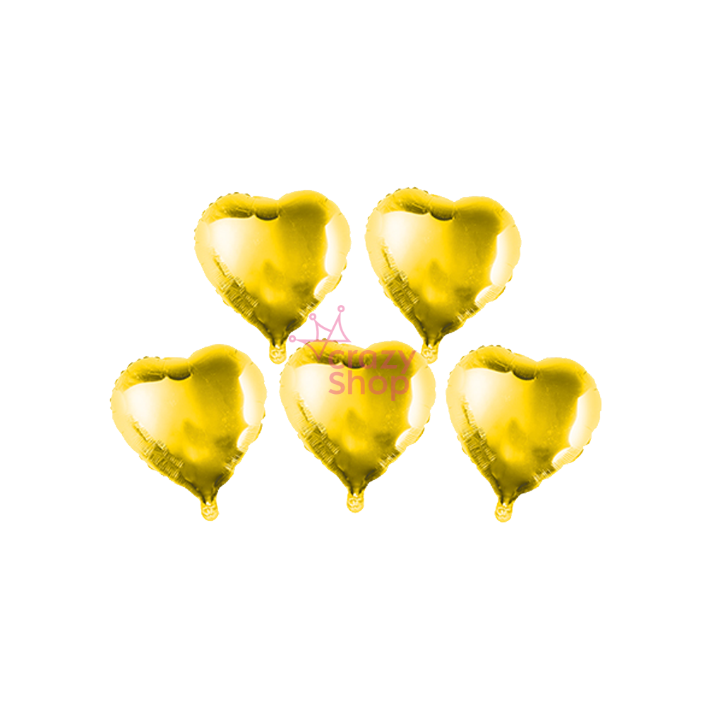 Pack de 5 globos metalizados con forma de corazón en color dorado, tamaño mini de 12 cm. Ideal para decorar fiestas, cumpleaños o mesas dulces. Incluye palitos de 15 cm para inflar y sostener fácilmente. Se inflan con aire, no requiere helio.