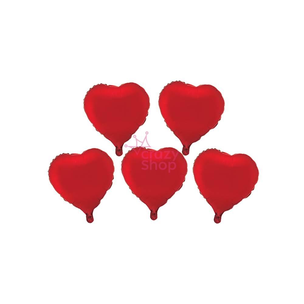 Pack de 5 globos metalizados con forma de corazon en color rojo, tamaño mini de 12 cm. Ideal para decorar fiestas, cumpleaños o mesas dulces. Incluye palitos de 15 cm para inflar y sostener fácilmente. Se inflan con aire, no requiere helio.